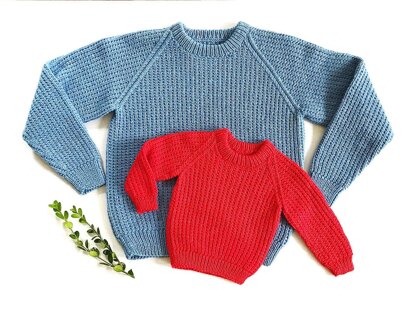 This sweater is a classic raglan with an all over easy rib stitch. The instructions for BOTH the child’s and adult’s sweaters are included in the pattern. It is knit in pieces and sewn together. Also, if you would rather have a plain sweater that just knit it in stockinette st instead of rib.