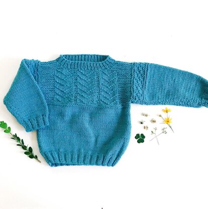 Guernsey inspired pullover with sizing available for 6 mos - and adults. The front and back are knit separately, the shoulder seams are sewn and the sleeve stitches are picked up at the shoulder and knit down. The finishing is easy because you don’t have to set in the sleeves, just seam from the sleeve cuff to the body cuff (one seam).