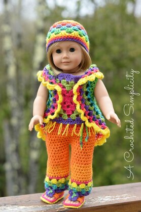 This 16 page pattern includes patterns for the following 5 pieces: Butterfly Circle Vest, Sandals, Pants, Hat, & Fringed Top.