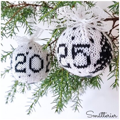 This little Christmas Bauble is knitted two-stranded in the round on dpns. The motif depicts two pine trees with the numbers 2025 central on the bauble, and it has a ribbon attached to the top for hanging. For these I’ve used fibre filling, but you may also knit around a plastic or glass bauble.
