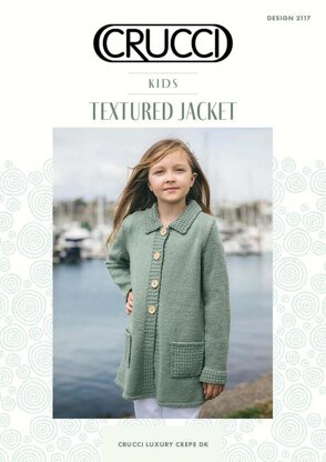 Knitting pattern for a Kids Textured Jacket. Uses CRUCCI Luxury Merino Crepe 8ply Wool. Intermediate skill level required. Comes in kids sizes 2-10.