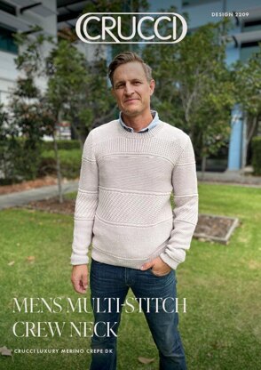 This pattern is for a men's multi stitch crew neck sweater, using Luxury Merino Crepe DK wool. Intermediate skill level required. Comes in sizes XS-XL.