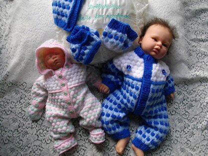 Instructions for a reborn doll's snow suit with detachable hood, mittens and snow boots in either 4ply or DK yarn depending on size. The set comprises of an all in one romper, hood, mittens and snow boots in a bubble pattern. When knitted this set will fit a 21-22 inch reborn, 19-20 inch reborn, 17-18 inch reborn or a 15-16" reborn. Some experience is needed with this pattern as it involves dropping stitches, but they need to be purposely dropped in set places and are picked up again from several rows down! You will need between 100-150g 4ply or double knitting yarn in main colour, 50-100g contrast colour 1 and 50-100g contrast colour 2, embellishments of your choice, either 2.75mm, 3.25, 3.75mm and 4mm needles, 1 stitch holder and 24 buttons.