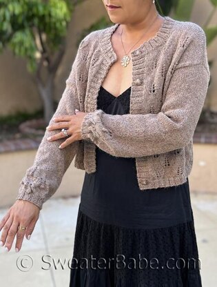 The shoulders are joined with a 3-needle bind off. Sleeves are then picked up and knit down with an inverted v-shaped version of the lace (with optional bobbles) accenting the sleeves. Stitches are then decreased to gather the cuff. The ribbed collar and front button bands are picked up and knit. Sides and sleeves are then seamed and buttons are attached.
