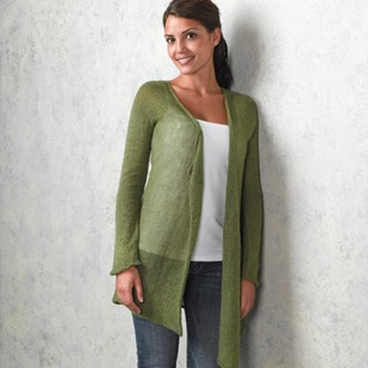 Knit in from each sleeve cuff towards the center of the back and grafted with Kitchener stitch, this asymmetrical cardigan can be worn closed with a shawl pin to show off the ruffle effect at the front or open to showcase the asymmetrical hem. It's not only cosy with the silky softness of Valley Yarns 2/14 Alpaca Silk, it's also an extremely flattering layer to add to your wardrobe.