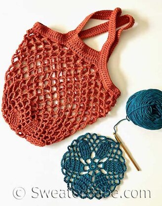 Shop all your local farmer’s markets with this lovely market bag – the big sister to my [#346 floral mini market bag][1] (sold separately)! It begins with crocheting the lovely floral motif. Then, the sides are crocheted up in an open mesh. The bag finishes with the top borders and solid straps. A great gift you can crochet in vibrant colors for all your friends.