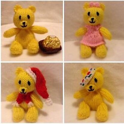 The teddy bear measures 10 cms and not only does it make a good toy for little hands but it can be used as a chocolate cover. The pattern is for the bear, eyepatch, dress and hat and scarf and it is a great way to use up your oddments of wool.