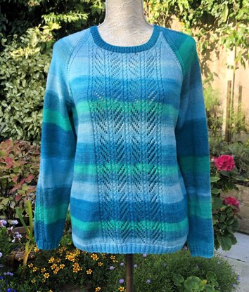 A charming raglan sweater featuring alternating eyelet panels, each accented with vertical 3-stitch twisted mock cables - simple to work with no cable needle required! The background is in smooth stocking stitch, framed by neat single-rib borders. Luxuriously soft and wonderfully comfortable to wear in this 4 ply yarn. Worked bottom up and with full written instructions.