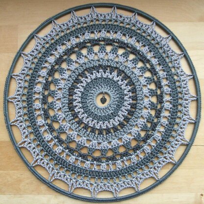 This mandala uses 4 shades of grey 100% cotton yarn and has a charm attached in the center of the mandala. This 8-pages pattern tells you how to crochet your mandala into a 12 inch/30 cm diameter metal ring. You could even make it into a dream catcher if you want! There are also detailed pictures of each round, and also instructions are given on how to crochet your mandala into a metal ring. This is an advanced beginners pattern. US-crochet terms are used.