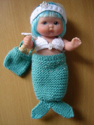 Written in UK terms. Easy to knit. Includes mermaid tail, bikini top and panties, bag, headband and shoes.
