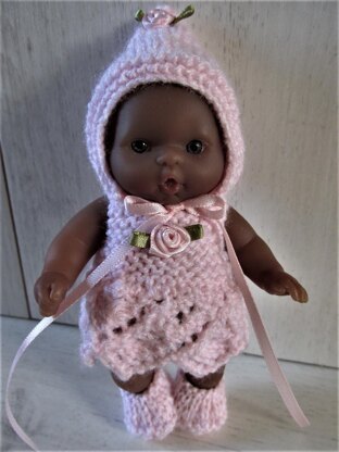 Easy to make outfit for 5" Berenguer doll using 4ply or 3ply yarn and 2.25mm straight needles. The lace skirt of the dress is knitted first then the bodice is knitted onto it and finished in one piece, instructions also for pixie hat, panties and shoes.