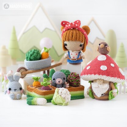 5-in-1 vegetable patch crochet pattern amigurumi by AradiyaToys mini kingdom mushroom gnome crochet tutorial DIY PDF file bunny garden girl by AradiyaToys (Olka Novytska)