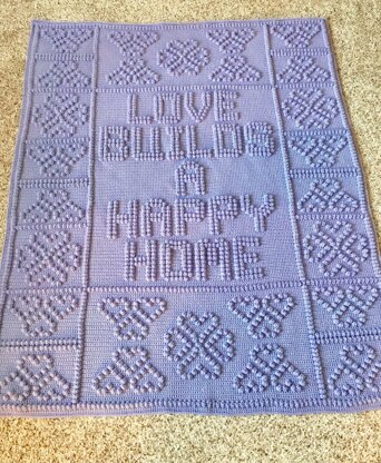 This is a one piece blanket that reads LOVE BUILDS A HAPPY HOME. blanket in photo was made with Caron One Pound & G hook. Yarn choice, hook size and tension may alter finished size.