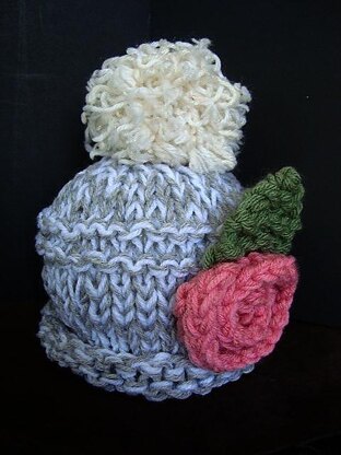 The finished hat is quite stretchy, so it is a relaxed fit, and will fit several sizes. You will need worsted weight yarn, and one pair of size 10 mm (US 15 ) knitting needles. Video links are provided for How to cast on, cast off, and sew a seam in a knitted hat. Knit flat, with a back seam. The bottom will roll automatically. The flower and the leaf patterns are also included in this pattern. Instructions on how to make a pom pom also included. As always, my patterns are written without abbreviations.