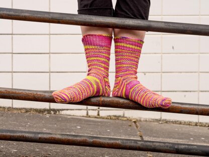 Inspired by life in the slow lane on the 59th Street Bridge, these toe-up socks are a joyful challenge to knit. The combination of modified linen stitch and twisted ribbing play oh, so nicely with a highly variegated skein of yarn, and, in sport-weight yarn, these socks are squishy and comfy to wear.