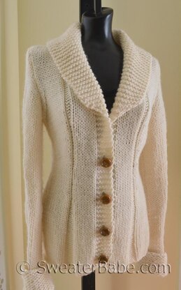 From SweaterBabe: A beautifully detailed cardigan that goes with most everything! Designed with reverse Stockinette stitch "seaming" to accentuate the waist shaping. Garter stitch button bands are curved at the bottom hem and knit in as part of the front sections.