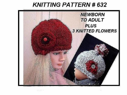 Hat Knitting Pattern - RED CLOCHE, oversized beanie - Adjustable - (Newborn baby, Toddler, Child, Women Adult sizes) #632 and 3 KNITTED FLOWER PATTERNS INCLUDED IN THIS PATTERN! INSTANT DIGITAL DOWNLOAD PDF TUTORIAL PATTERN. Even a beginner can make this hat, in any size from newborn baby to adult sizes. My patterns are written with beginners in mind, and have no abbreviations, so they are easy to read and understand. See more patterns here in my RAVELRY SHOP: http://www.ravelry.com/designers/emi-harrington OR in this shop: https://www.etsy.com/shop/HatAndScarfPatterns OR in my Hectanooga shop: https://www.etsy.com/shop/Hectanooga