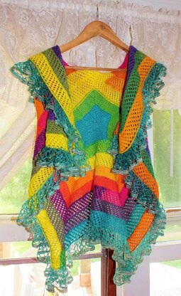 This is a pattern that is the offshoot of my 10 stitch star blanket pattern but it adds new techniques into it to create arm holes, lacing, and adding a ruffle edge. This pattern is well worth the new education on getting creative with the 10 stitch blanket concepts. But this isn't 10 stitches it is 8, but the pattern would be easy enough to add 2 more stitches if desired. I provide video tutorials and written instructions. I also provide picture tutorials for doing the terminology for this pattern. I would say this is an intermediate level pattern as there are things to keep in mind and keep up with. I used 1 and 1/2 skeins of the Lions Brand Mandala and a 3/8" gauge loom for the project. I also used 1 skein of Red Heart Boutique Ruffle Yarn. Now this pattern can be done with thicker yarn and different gauge you may need to do less rounds and such but it is open to have fun and play with the pattern.