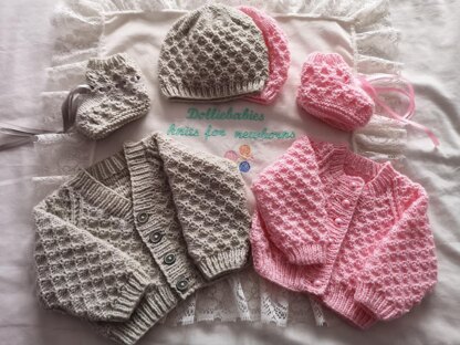 Instructions for a really practical round neck or v neck cardigan with matching beanie hat and bootees. It is knitted in a lightly textured stitch on reverse stocking stitch. This pattern is worked with buttonholes on both sides of the bands so it is truly unisex if knitted in neutral colours, and it can be made well in advance of knowing what baby's gender is. Once you know, you have just a few minutes work to sew up the unwanted buttonholes and sew the buttons over the top. It is knitted in either 4ply or dk yarn depending of what size you wish you knit.