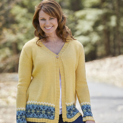 Giverny Cardigan from Valley Yarns is a women’s jumper knit in Colrain from the bottom up featuring a deep v-neck with a single button closure. The Fair Isle hem border is worked in the round and then steeked while the matching Fair Isle sleeve bands are worked in the round down to the ribbed cuff. Colrain is a dream to work with! Tencel® adds a lovely luminosity to your work while enhancing the yarn's durability making it perfect for outerwear projects. The Fair Isle patterns for the body and sleeves of this knitting pattern are charted.