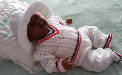 Instructions for a really cute cricket set for a baby boy. There are no cables to be worked in this set. The set comprises of a V neck sweater, wide-brimmed hat, slip on plimsoles and trousers with knitted in shin pads.