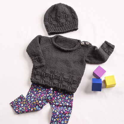 baby’s textured jumper and hat knit in Montague. The set sure keeps your