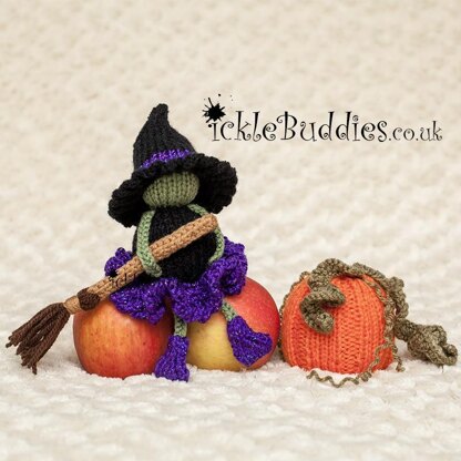 Knit your own tiny 9cm Witch with a broomstick and Pumpkin Chocolate Orange or Apple cover.