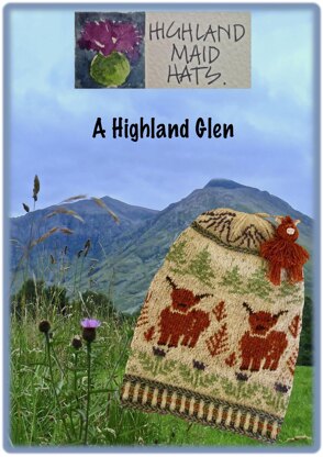 When I think about ‘A Highland Glen,’ I always picture heather-coloured mountains, golden bracken, thistles and fir trees and if a few Highland cows are grazing there, it makes it an even more magical place for me. This has given me the inspiration for this hat, which I hope you will enjoy knitting.
