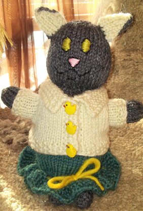 The cat is done primarily in the round, except for the ears that are knit flat as intarsia. The button-down shirt is knit flat, with seed stitch hem and cuffs and garter stitch collar. The skirt is knit in the round with a seed stitch ruffle and decorative bow.