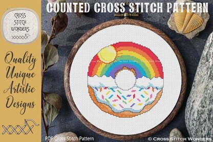 A YEAR OF DONUTS - JUNE!\nAll 12 monthly Donuts looks good enough to eat!\nSo much fun no matter how you use them! And even better, no calories! lol\nCross Stitch Patterns designed by Marcia Manning.\nEach month's Donut is the same size: 80 stitches wide by 80 stitches high.\nPDF is a COLOR counted cross stitch chart which lists suggested DMC floss colors, and includes a color picture.\nStitched design size is as follows: \n11 count: about 7.27" x 7.27"\n14 count: about 5.71" x 5.71"\n16 count: about 5.00" x 5.00"\n18 count: about 4.44" x 4.44"\n\nAdditional image shows October's Donut stitched on our matching BLANK. Image on the left as a coaster and image on the right as an insert into my "It's A Wrap" pillow wrap/wall hanging. Sewing pattern is available as well as the cross stitch blanks.