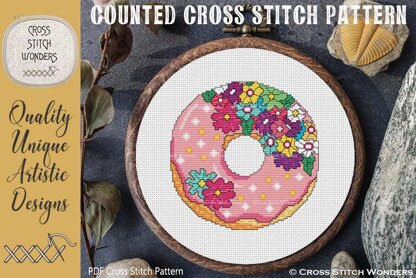A YEAR OF DONUTS - MAY!\nAll 12 monthly Donuts looks good enough to eat!\nSo much fun no matter how you use them! And even better, no calories! lol\nCross Stitch Patterns designed by Marcia Manning.\nEach month's Donut is the same size: 80 stitches wide by 80 stitches high.\nPDF is a COLOR counted cross stitch chart which lists suggested DMC floss colors, and includes a color picture.\nStitched design size is as follows: \n11 count: about 7.27" x 7.27"\n14 count: about 5.71" x 5.71"\n16 count: about 5.00" x 5.00"\n18 count: about 4.44" x 4.44"\n\nAdditional image shows October's Donut stitched on our matching BLANK. Image on the left as a coaster and image on the right as an insert into my "It's A Wrap" pillow wrap/wall hanging. Sewing pattern is available as well as the cross stitch blanks.