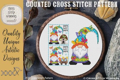 APRIL - A YEAR OF GNOMES!\nCross Stitch designs by Marcia Manning.\nEach monthly Gnome comes with three designs.\nOne of the Gnome and a wagon, one of the Gnome and a mushroom hut, and one of the Gnome alone.\nThe wagon and hut designs are 92 stitches wide by 92 stitches high.\nThe Gnome by itself will be within 86 stitches wide and high.\nStitch the entire design or just the Gnome!\nPDF is a COLOR counted cross stitch chart which lists suggested DMC floss colors, and includes a color picture.\nStitched design size is as follows:\nSize 11 count: 8.36 x 8.36 inches or 21.24 x 21.24 cm\nSize 14 count: 6.57 x 6.57 inches or 16.69 x 16.69 cm\nSize 16 count: 5.75 x 5.75 inches or 14.61 x 14.61 cm\nSize 18 count: 5.11 x 5.11 inches or 12.98 x 12.98 cm