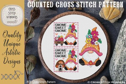MAY - A YEAR OF GNOMES!\nCross Stitch designs by Marcia Manning.\nEach monthly Gnome comes with three designs.\nOne of the Gnome and a wagon, one of the Gnome and a mushroom hut, and one of the Gnome alone.\nThe wagon and hut designs are 92 stitches wide by 92 stitches high.\nThe Gnome by itself will be within 86 stitches wide and high.\nStitch the entire design or just the Gnome!\nPDF is a COLOR counted cross stitch chart which lists suggested DMC floss colors, and includes a color picture.\nStitched design size is as follows:\nSize 11 count: 8.36 x 8.36 inches or 21.24 x 21.24 cm\nSize 14 count: 6.57 x 6.57 inches or 16.69 x 16.69 cm\nSize 16 count: 5.75 x 5.75 inches or 14.61 x 14.61 cm\nSize 18 count: 5.11 x 5.11 inches or 12.98 x 12.98 cm