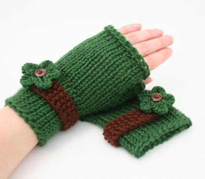 Fingerless gloves with applique band and flower. These gloves are quick and easy, but still have lots of personality! All pieces are knitted, including the flower. Pattern is clear and easy to follow!