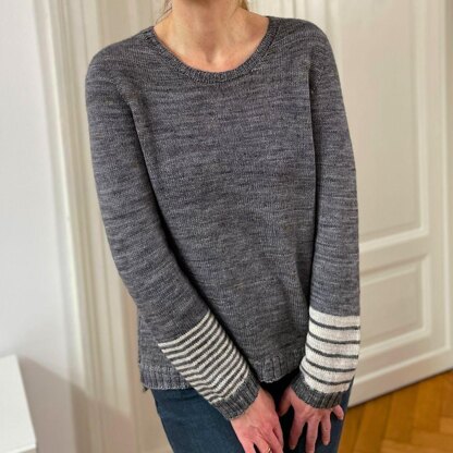 Aadi Pullover is a classic pullover with a round neck. It’s primarily worked in stockinette stitch. Only the hems, cuffs and neckband are worked in ribbing. Additionally, a ribbed “side seam” under each arm at the lower body provide variety. For a casual look, the pullover features split hems, with the back hem being longer than the front hem. Different stripe sequences on both lower sleeves add further interest. The pullover is worked top down in one piece.