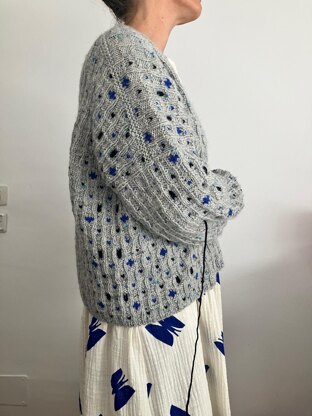 This cardigan is knitted from the bottom up. First, the body is worked to the armholes, then the fronts and back are worked separately. The back is knitted with German Short Rows to create a shoulder drop. The shoulders are joined with a 3 – Needle Bind Off. The sleeves are worked top down in the round and feature a 1 x 1 ribbing and an Italian Bind-Off. Button bands are worked in neat double knitting, picking up stitches along the fronts and neck. Lastly, duplicate stitches are worked in two colours to give the garment a final touch.