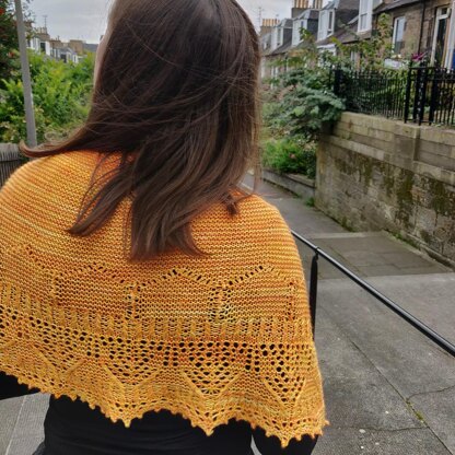 This shawl was designed especially for the Colony of Artists festival held in the Abbeyhill Colonies in Edinburgh each September. Knit from the centre down, the garter stitch base sets off the rythmic lace pattern.