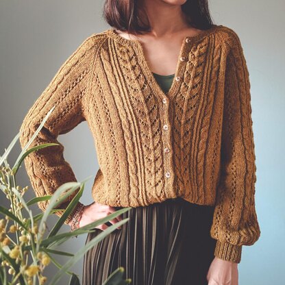 Acacia Cardigan is a top-down, seamless cardigan with round neck and shaped with raglan increase, combination of cables, twisted stitches, and eyelets. Some short rows are worked to create a higher back neck. The button bands are knit at the same time with the cardigan, so you do not have to pick up stitches at the end.