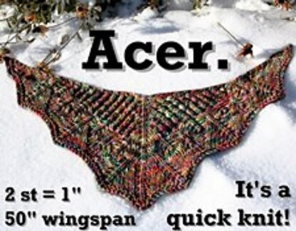 If you’d like to see full information about this pattern, please visit http://www.ravelry.com/patterns/library/acer-shawl . . . . . . . If you’d like to see other work by Kourtney Robinson, please visit her designer page here http://www.ravelry.com/designers/kourtney-robinson . . . . . . . Macro lace and super bulky yarn combine for the perfect accessory to ease into winter. I’ve borrowed part of the species name of the big-leaf maple (acer macrophyllum) to reflect the leaves of the edge. This shawl won’t be as large as the tree, but it knits up quickly and it’ll keep you warm even while it’s a work in progress.