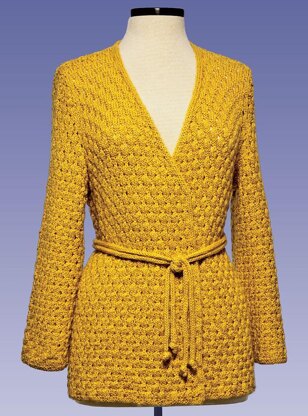 The lovely Acorn Stitch pattern is an easy one to memorize; it’s basically a checkerboard with yarnovers and decreases every 4 rows. This cardigan is worked in one piece from the bottom to the armholes (including a 4-stitch integrated front edging which is continued later to form the back neckband), then the fronts and back are worked separately to the shoulders, which are joined using 3-Needle Bind-Off. The sleeves are worked in the round from the bottom up, then sewn in. The front edgings are continued along the back neck to the center back, attaching the edging to the back neck as you go. There are two sleeve versions – a 3/4-length sleeve and a long sleeve. Work the I-Cord ties as instructed, or use a shawl pin or stick pin to close the fronts.