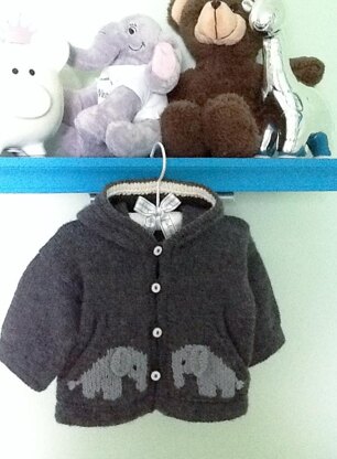 I wanted to design a hooded baby sweater that would be gender neutral and fun to knit. This little cardigan flows, incorporating interesting detail with a polished finished look. The sweater is knit from the bottom up in one piece; pockets are created along with the body as you go. Contrast color facings can be subtle, or provide a pop of color. The little elephants are worked in duplicate stitch on the pockets.