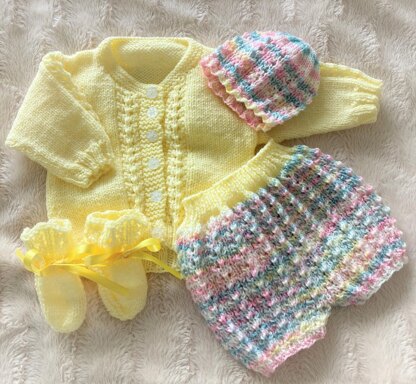 This knitting pattern makes a lovely little outfit for baby / 3-6 months The pattern includes instructions for : Hat. Jacket. Bootees .Shorts.