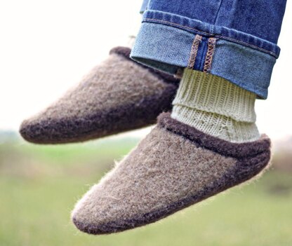 Construction: First knit the clog in the round, then pick up sts inside the rim of the clog for the faux sock. Felt the clog, finish the sock, and voilà!, a 2-in-1 slipper that stays on and a sock that never gets lost!