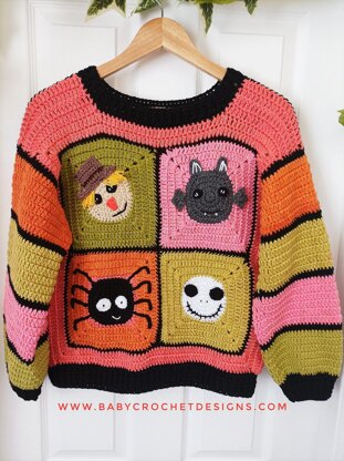 This cute and quirky sweater is made with four granny squares at the front and four at the back. Then shaping and adding sleeves. The pattern has a choice of pumpkin and spider squares included, with many more spooky mods available on my website. I also have many more mods for other themes available for free on my website too!