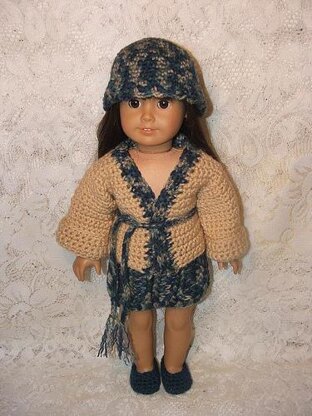 Fashionable fall outfit for the American Girl includes skirt, jacket with tie belt, hat and shoes. Skill Level: Intermediate