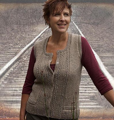 Front panels of eyelet rib grow with slight variation from the bottom trim to the scoop neck of this romantic vest. to tuck one or two full or faux pockets on either side as you knit or when you’re finishing. An eyelet lace panel gives interest to the lower back and delicate tendrils of eyelets appear again in a back neck eyelet panel. Clear instructions and the magic of double knitting will help you create a back band that’s stockinette on the inside and ribbed on the outside for style, comfort, and stability. Double-sided neck and front bands give structure to the delicate lace. Finish with snaps or hooks and eyes to allow the vertical lines to continue without interruption, giving the final polish to your Agate Vest.