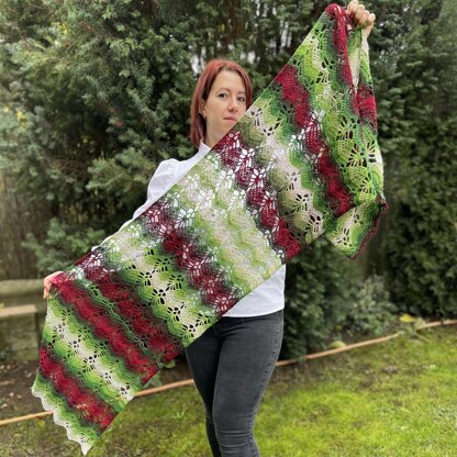 I named it Aikor Shawl. Aikor means pine-tree in elvish which refers to the little motifs in the pattern, looking like cute pine-trees.