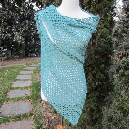 Ainsley is a lacy parallelogram-shaped wrap with an unusual stitch combination. It is light and airy, and the stitches create a biased fabric. The simple edging complements the unusual stitches in the body of the wrap.