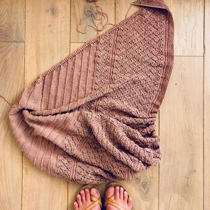 Akemi is a triangular shawl worked flat from the top down. The textured body includes 2 lace pattern bands and is accented by small garter stitch stripes, even some tiny little bobbles found their way into the shawl ;) The lace pattern bands make this a fun and entertaining knit… a versatile, but special, companion for everyday.