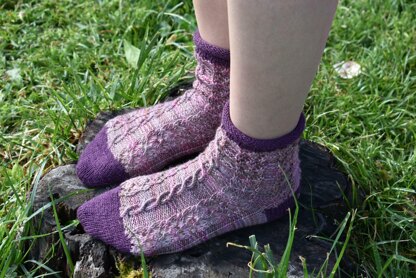 Ce modèle se tricote avec la méthode toe-up = de la pointe vers le haut de la cheville, avec la technique Judy’s magic cast on = montage des mailles (Turkish cast on est aussi très bien pour ce genre de modèle) pour la pointe des pieds, puis je fais la méthode German short row = rangs raccourcis pour le talon.